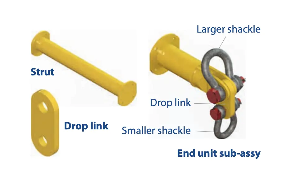 The Modulift Spreader is modular in length, and every spreader consists of 1 pair of End Units and Drop Links, with intermediate struts that can be bolted into the assembly to achieve different spans.
